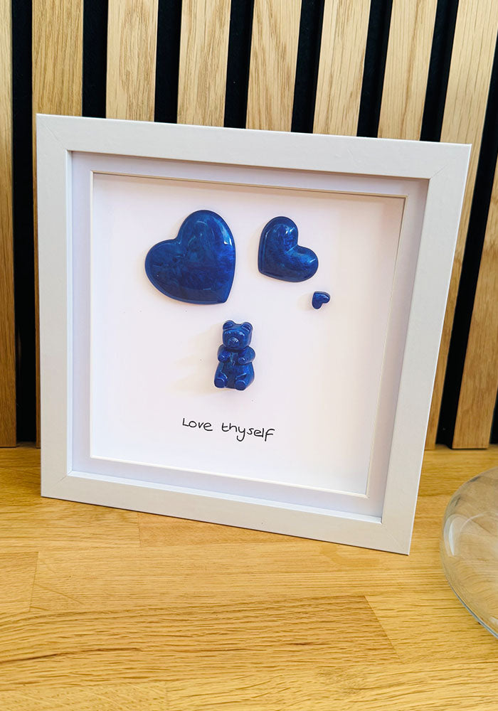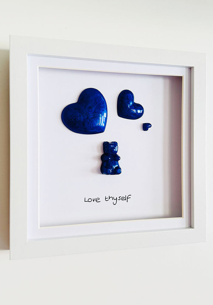 Serene and quietly powerful, Blue Within is a heartfelt tribute to self-love and inner stillness. A single deep blue resin bear stands beneath a trio of gently ascending hearts, each hand-poured in rich navy tones that shimmer softly in the light. Framed in crisp white wood and set against a clean white backdrop, the handwritten phrase “Love thyself” offers a gentle daily affirmation. A calming, contemporary artwork that speaks to those on a journey of self-kindness.
