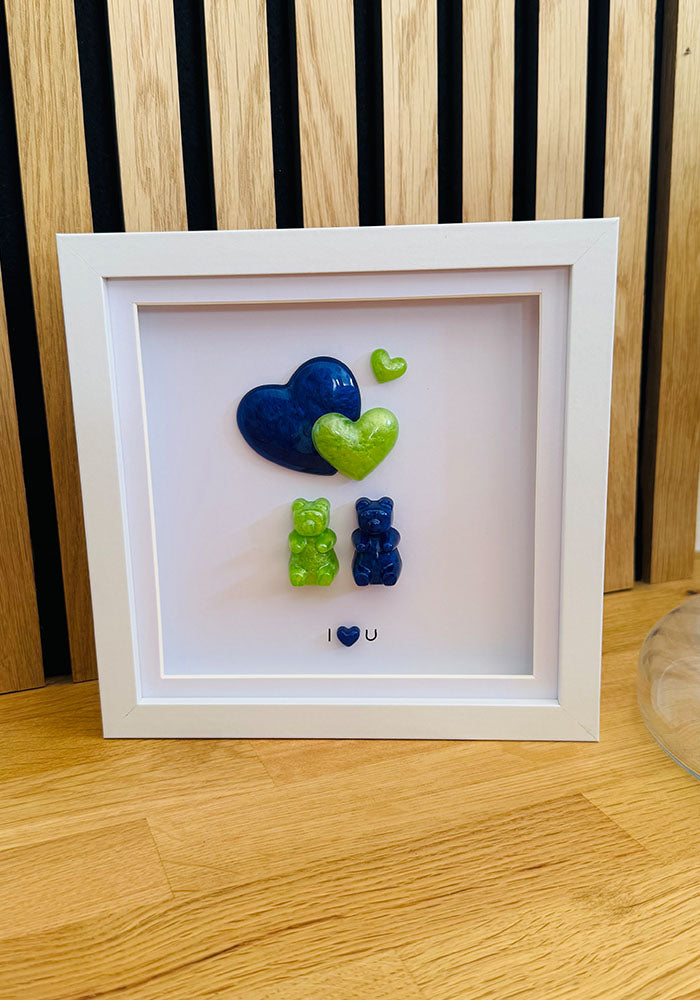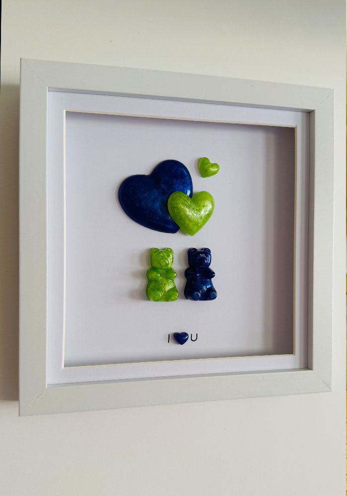 Fresh, contemporary, and full of charm, Evergreen Love pairs deep navy and zesty lime in a dance of playful affection. Hand-poured resin hearts—one layered and two miniature—float above a complementary gummy bear pair, all arranged against a crisp white backdrop. The understated “I ♥ U” motif is finished with a navy resin heart, grounding the piece in quiet sentiment. Framed in white wood, this one-of-a-kind artwork brings together modern colourplay with heartfelt expression.