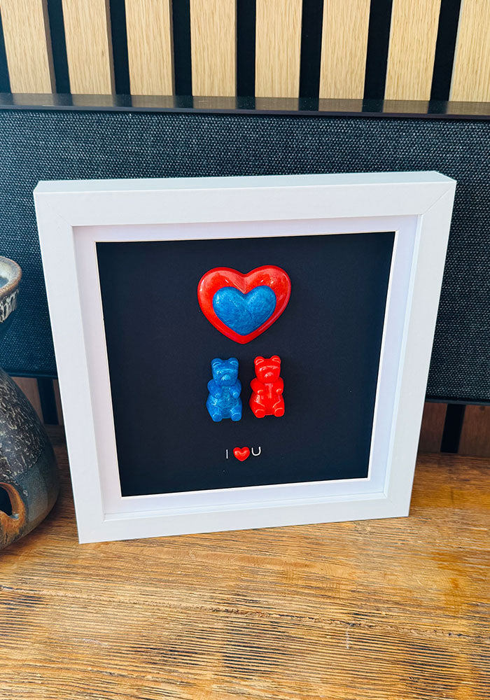 Tender and symbolic, Inseparable captures the beauty of connection through a striking resin heart—two tones intertwined in one perfect form. Framed beneath this emblem of unity are two glossy resin bears in complementary red and blue, sweetly positioned above an “I ♥ U” message. Set against a rich black backdrop and housed in a white wood frame, this piece radiates warmth and whimsy, making it a thoughtful gift or a cherished addition to your own space.