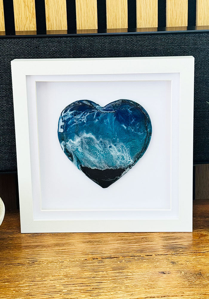 Hand-poured on natural slate, the heart-shaped resin captures layered tones of deep blue, teal, soft white, and shoreline black—resembling waves breaking over rock. Framed in a crisp white box frame, this piece offers a gentle contrast of texture and tone. The slate adds earthy weight and grounding to the fluid resin, making each piece quietly powerful and truly unique.