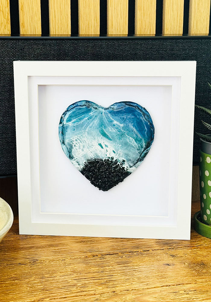 Hand-poured on natural slate, the heart-shaped resin captures layered tones of deep blue, teal, soft white, and shoreline black—resembling waves breaking over rock. Framed in a crisp white box frame, this piece offers a gentle contrast of texture and tone. The slate adds earthy weight and grounding to the fluid resin, making each piece quietly powerful and truly unique.