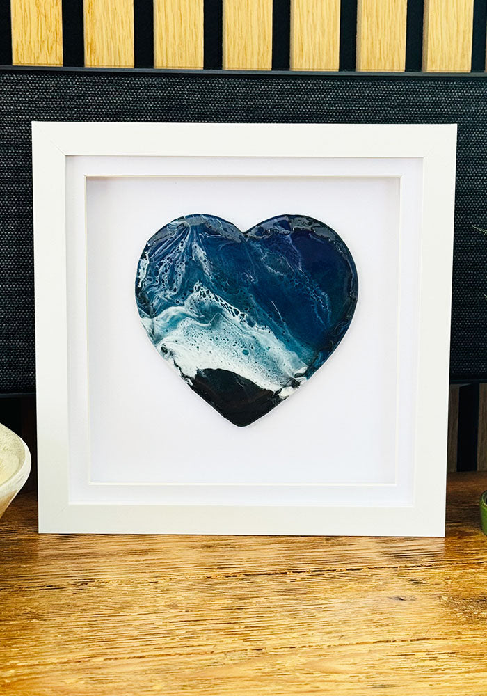 Hand-poured on natural slate, the heart-shaped resin captures layered tones of deep blue, teal, soft white, and shoreline black—resembling waves breaking over rock. Framed in a crisp white box frame, this piece offers a gentle contrast of texture and tone. The slate adds earthy weight and grounding to the fluid resin, making each piece quietly powerful and truly unique.